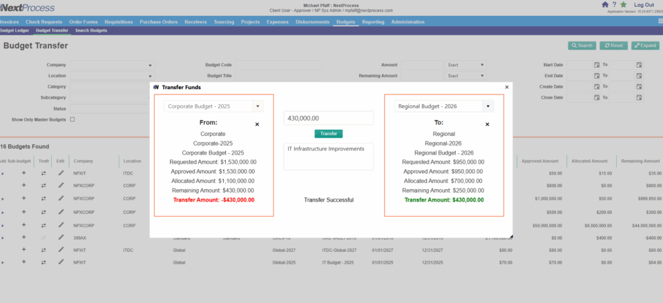 - Dynamic Fund Management: Transfer funds between budgets and link them to adapt to shifting priorities, utilizing approval authority and audit controls.